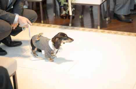 愛犬は大切な家族の一員。だからこそ結婚式は愛犬も含めた家族みんなで過ごしたいですよね♪おふたりも大切な家族の一員のうに君に『リングドッグ』として活躍してもらいました!タキシードを着て新郎様のようにピシッと決めて テクテクと歩く愛らしい姿に会場のゲストも思わずうっとり♡役割を完璧にこなしたうに君にはその後も夫婦となるふたりの門出を見守ってもらいました☆