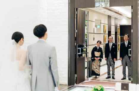 挙式リハーサルが始まる前に、両家の親御様とファミリーミートを…♡扉が開きタキシードとドレスに身を包んだ新郎新婦様を見るなり嬉しそうな表情を浮かべた親御様たち。おふたりも大好きな親御様の姿を確認したことでこれから始まる挙式への緊張が少し和らいだのか、ほっとしたようにも見えました。 晴れの日の姿を親御様に1番に見ていただきたい…そんな想いが詰まった温かい時間となりました。