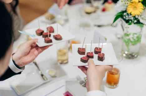 披露宴のメインイベントは、見学に来られた時から「やりたい!」と仰っていた格付けゲーム♪お色直し入場の後にゲスト皆様に参加していただきました。 全部で用意されたクイズは4問。1問目は肉の食べ比べクイズとなり、テーブルに一口サイズの肉が乗った皿が配られます。一斉に口にすると反応は様々!すぐに答えがわかった方もいれば、真剣に悩まれる方の姿も。クイズには新郎様も参加され、新婦様が正解発表をされました!