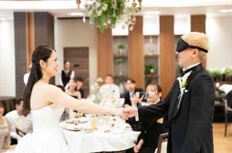テーブル対抗で企画された全員参加のクイズ大会。新郎新婦様にちなんだ問題として、初めてデートされた場所やプロポーズの言葉を当てるクイズなどが出題されました。 特に盛り上がりを見せたのは、目隠しをした新郎様が新婦様の手を当てるクイズ…♪少し緊張感もあったクイズの結末は、見事に新郎様が新婦様の手を当て大正解!おふたりもとても嬉しそうにハイタッチで喜びを表現され、会場内も歓声があがりました♡