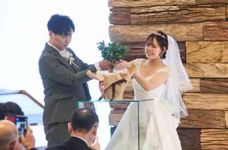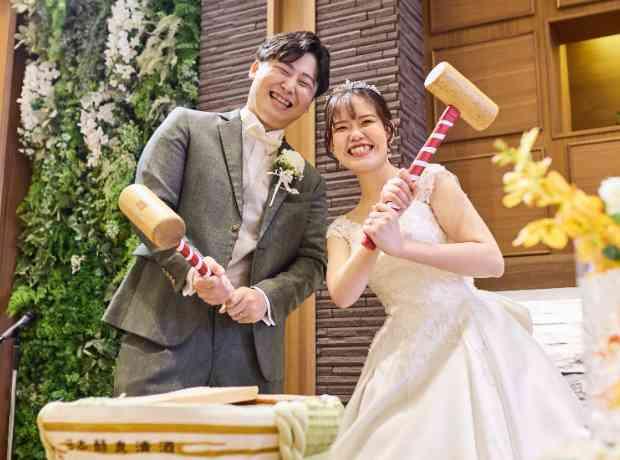 披露宴では日本酒の入った大きな樽の蓋を木槌で叩いて開ける伝統的な演出「鏡開き」をおこないました。円満・和・繋がりを象徴する酒樽の丸い蓋を開けるこの儀式は、未来の発展・運を開くという意味に繋がると言われ、結婚という新たな門出においてぴったりな演出です。 また儀式が結んだ後は、普段日本酒を飲む機会がないという方々も「せっかくなので…」と縁起のいい樽酒を嗜む姿も見られました。