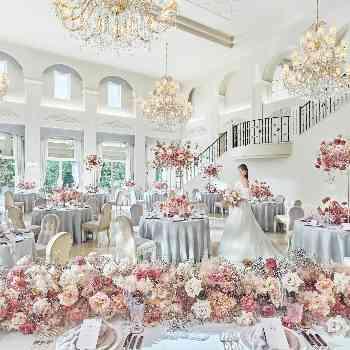 - 白が基調華やかな雰囲気の会場は、おふたり次第で何色にも染まる。