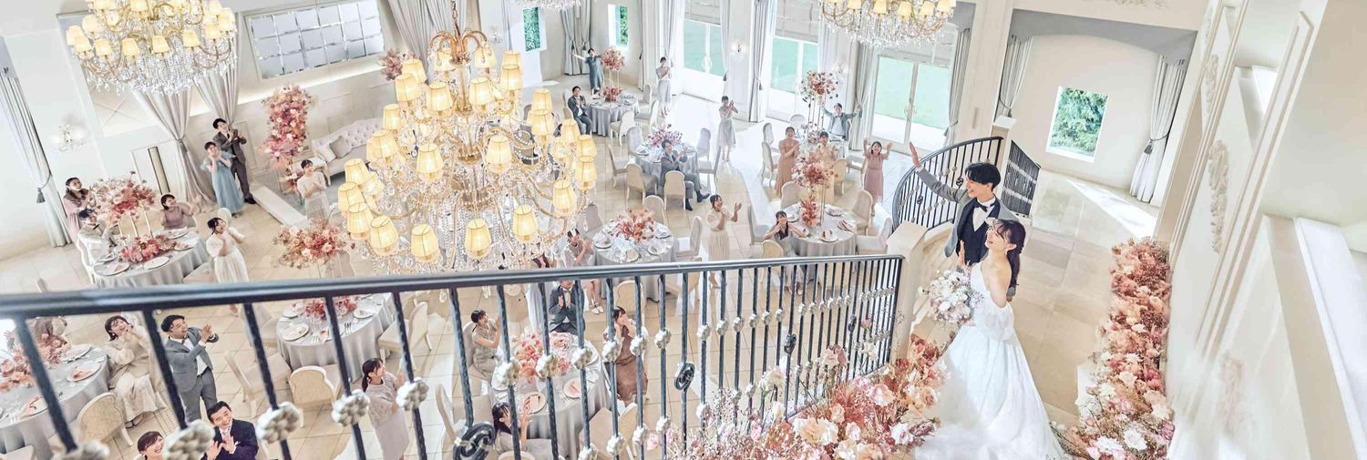 純白の空間に輝くシャンデリアや大階段、プライベートガーデンは、まるでヨーロッパのお城のよう。花嫁の憧れを満たす白を基調にしたインテリアでまとめられ、大きな窓からは自然光が差し込み明るい空間を演出します