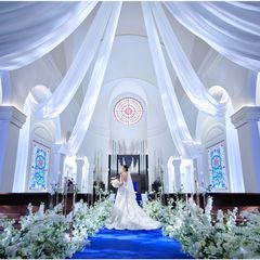 【ロイヤルブルーの大聖堂で挙式体験】花嫁の憧れを叶えるチャペルへおふたりで入場体験!本格的なチャペルは、11mのバージンロードや13mの天井高をご用意!大阪唯一のチャペル映像体験をご用意♪