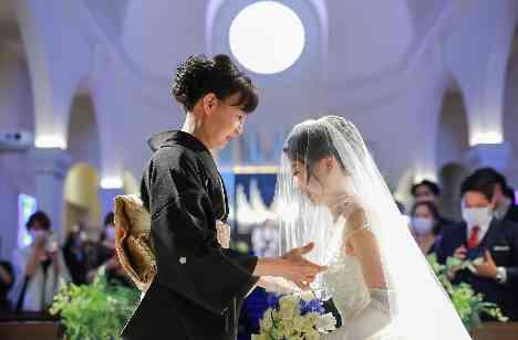 「大好きなお母さんにベールダウンをしてもらいたい」ずっと心に抱いていた想いを当日叶えました。チャペルの扉が開くと、ライトで照らされていて、とても特別な時間になりました。ゲストにも「ドレス姿がとても輝いて見えた」と好評でした。 ロイヤルブルーのバージンロードには、「永遠」という意味が込められています。 本当に大切な人たちの前で、挙式を行うことができ、今でも大切な思い出です。