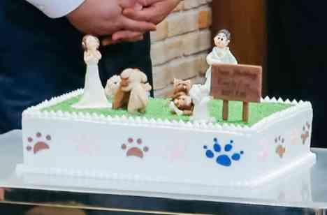 ふたり・実家には合計6匹のわんちゃんがいるので結婚式当日にも一緒に参加したい!式場探しの時から譲れないポイントでした。ただ、当日はどうしてもわんちゃんだけの時間ができたり、さみしい思いをさせてしまう・・・悩んだ結果、ケーキのデザインで実現することに!デッサンしたデザインと写真を基に完成したケーキはとてもかわいくてゲストもオリジナリティにワクワクしてくれました。