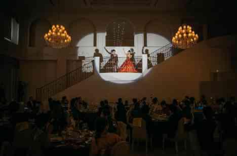 再入場は大階段の上からご登場されたご新郎ご新婦様。お2人で仲良く階段をおりてご入場かと思いきや、手にはマイクが!なんとお2人で嵐の「Love so sweet」を歌いながらのご登場でした! 実は事前に歌いながら、大階段を上手に降りることができるかの練習もしっかりされていたお2人。練習の甲斐もあって、当日は見事、大成功!ご親族もご友人も笑顔に包まれた再入場になりました。