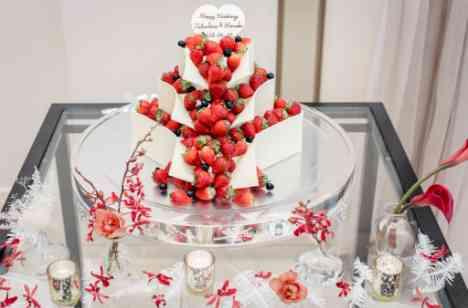 お2人がご用意されたのは、ウェディングケーキからイチゴが溢れるとっても素敵なケーキです。装飾のお花とも相性がよく、会場のコーディネートにもぴったりです。特にウェディングケーキはご新郎様のこだわりがつまっているそうで、【3段・イチゴいっぱい】は絶対!だったそうです。当日はこだわりがつまったケーキをおいしくお召し上がりいただきました。