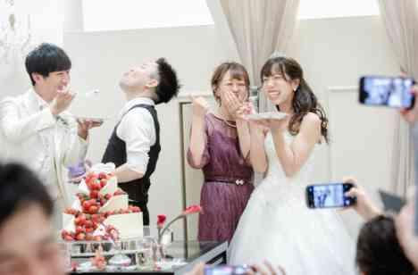 お2人がゲストの方に内緒でご準備されたのは、とっても可愛いウェディングケーキを使ったサプライズバイトです!!お名前を呼ばれたゲストの方もびっくりされていましたが、大きなお口でウェディングケーキを召し上がっていただきました。お2人とご友人の方の笑顔に、会場も大盛り上がり!お2人とご友人の絆を感じられる素敵な演出となりました。