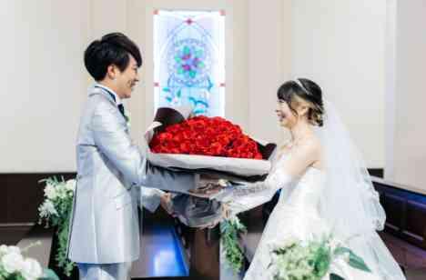 ご新郎様が挙式前にご用意されたのは、なんと108本のバラ。当日はチャペルのファーストミートにて、ご新婦様にお渡しをされました。突然のサプライズにご新婦様もびっくり!! 108本のバラには「結婚してください」という意味が込められています。また108は永遠(とわ)とも読めることから永遠を誓うともいわれています。結婚式でもしっかり想いを伝えられるご新郎様はとっても素敵ですね。