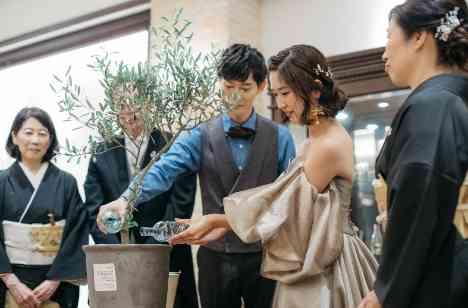 オリーブセレモニーとは、長寿の樹とされているオリーブの苗を使ったゲスト参加型の演出です。ご結婚式当日は新郎のご両親様と新婦のお母様にご登場いただき、オリーブの土を入れていただきました。その後、オリーブの植樹にご新郎ご新婦様でお水をそそいでいただき、完成です。植えたオリーブは「記念樹」として、今後の家族の成長を見守り続けます。お2人とともに育っていくオリーブセレモニーはとても心温まる演出です。