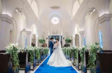 「真っ白なチャペルで王道のキリスト教式がしたい」と希望されていたおふたりは、当式場の白を基調とした明るい雰囲気のチャペルに一目惚れしたそう。また、バージンロードが青色でドレスがとても映えること、全天候型のため天気に左右されず綺麗な写真が撮れることも気に入ってくださいました。当日は、ご新婦衣装のロングベールがひと際美しく映え、ゲストの皆様もうっとりと眺めていらっしゃいました。