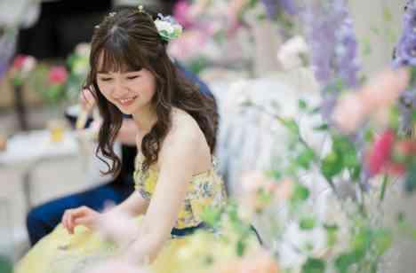 披露宴会場『シェルダジュール』は、シャンデリアや大階段があり、ご新婦が理想とされていた‟THEプリンセス”というイメージ通りだったそうです。白が基調で大人可愛い雰囲気のため、どんな色でもおふたりの好みに装飾しやすいところも気に入ってくださいました。会場に隣接しているガーデンでは、お色直しのパステルイエローのカラードレスも緑に映え、ゲストの皆様と写真撮影を楽しまれていました。