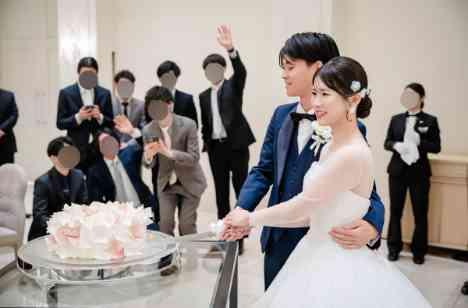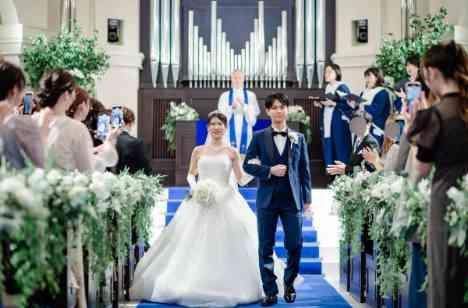 当式場の大聖堂は、天井が高く高級感があり、ほかにはあまりない青いバージンロードが特徴です。当日は、こだわって選んだ韓国風のグリッタードレスが、ご新婦が動くたびにキラキラと光り、青いバージンロードに映えていらっしゃいました。一番感動したのは、チャペル内の階段上でゲスト皆様の方を振り返った時、大好きなご家族や同期、ご友人全員が温かく見守ってくれていた光景を見た時だそう。