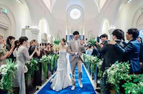 おふたりは、当式場チャペルの神秘的な雰囲気、他にはなかなかない青のバージンロードを気に入ってくださいました。 ご新婦は、テーマの“海”にも合うマーメイドラインのウェディングドレスを選び、ナチュラルなメイクに清楚なパールのアクセサリーを合わせ、ひと際美しく輝いていらっしゃいました。ゲスト皆様の、おふたりを見守る優しい笑顔が印象的です。