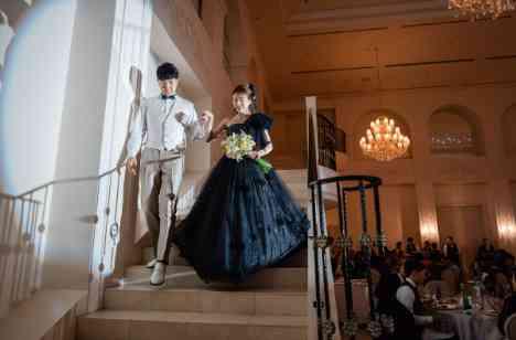 『シェルダジュール』は広く開放的でガーデンもあるため、屋内と屋外の両方を楽しめます。おふたりは、式場見学の際に会場の階段に一目惚れして、当式場に即決されたそう。お料理にもこだわり、既に決めていたコースから、試食で気に入ったお魚料理を「ぜひゲストの皆様に食べてほしい」と、変更されています。 お色直しの再入場では、キラキラ輝くブラックのドレスで登場。皆様の注目を一身に浴びていらっしゃいました。