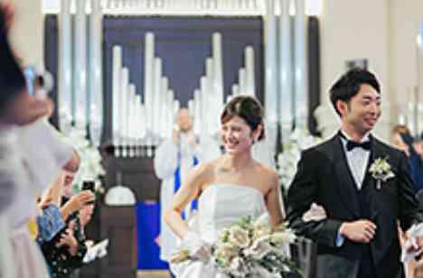 ふたり自身が東京在住で、新幹線を利用するゲストも多いため、新大阪駅からのアクセスのしやすさを重視しました。立地の良さやガーデン付きの貸切邸宅も理想にぴったりで、特に惹かれたのはチャペルの雰囲気だそう。「高い天井や青く美しいバージンロード、感動的な場面に導いてくれるライトアップ演出にも魅了されました」。