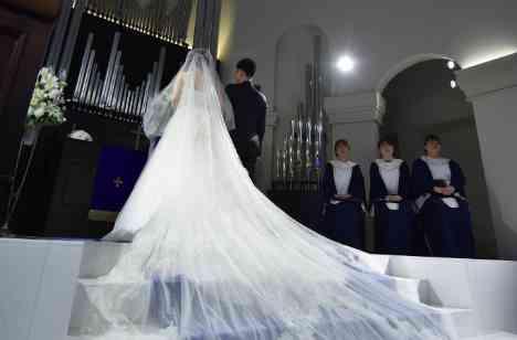 アニヴェルセルの「ロイヤルブルーのバージンロード」には"永遠の愛"という意味が込められています。 天井の高さもゆうに10メートルを超える大聖堂。 挙式のはじまりはオルガニストの演奏と聖歌隊による生演奏は 独立型のチャペルならではの迫力がありました。 式中は祝福の言葉とともに拍手が鳴り響きました。
