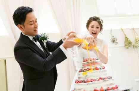 ケーキ入刀ではなくケーキにシロップをかけるカラードリップという演出でゲストも大盛り上がり!! こちらのケーキはプライベートガーデンで行うデザートビュッフェでゲストの皆様にお二人からお渡し。 その際、新郎様はターンテーブルを持ち込みDJタイムを楽しみながらアットホームな時間をゲストと過ごして頂きました。