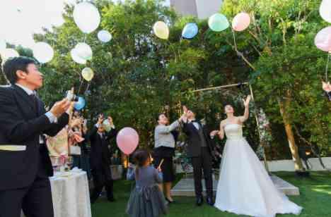 広大なお庭にて90名を超える人数による一斉のバルーンリリース。大空に舞い上がる色とりどりのバルーンと ゲストの笑顔が印象的でした。 バルーンの中には植物の種が入っており、お二人の幸せが未来永劫続く様に、という意味があります。 植物の種はどこかで根をはり、根強く、そして美しく花を咲かせる様祈りながらリリースするバルーンは圧巻の景観です。