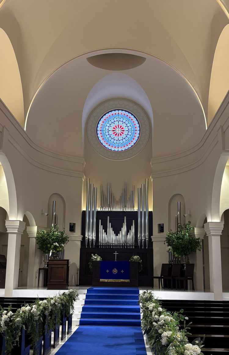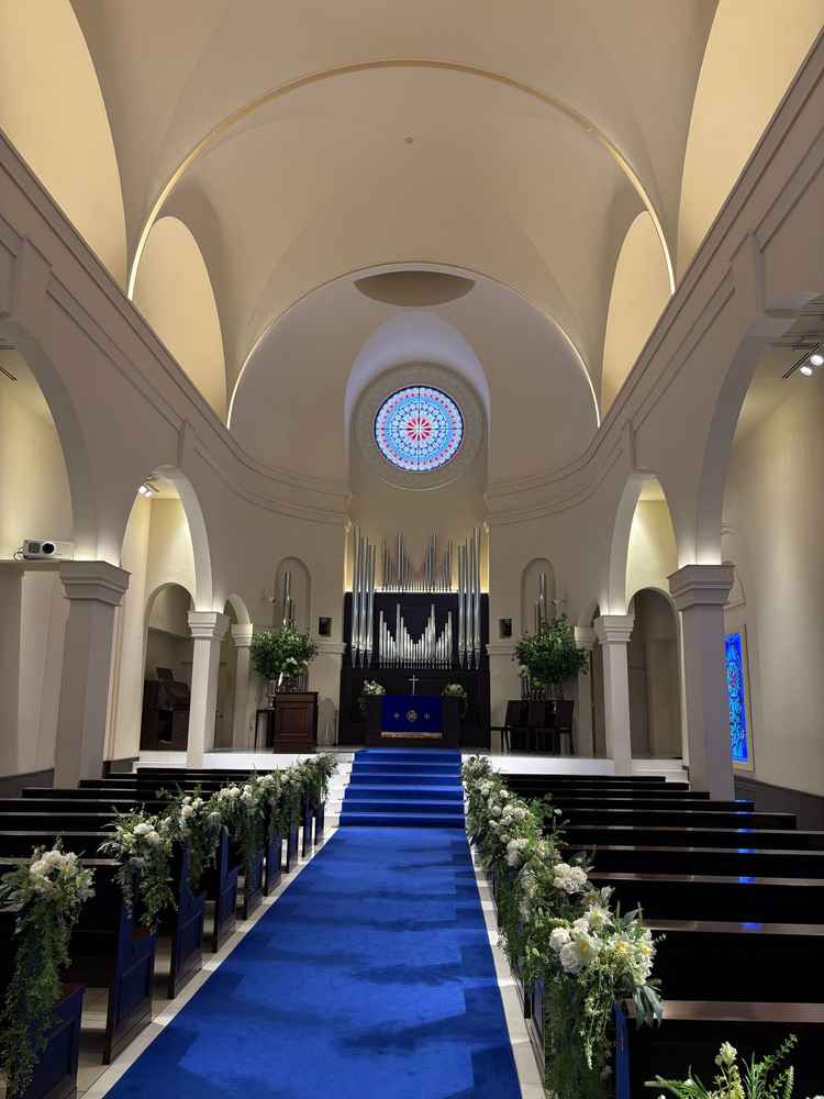 全天候型の安心感と青いバージンロードが魅力の式場