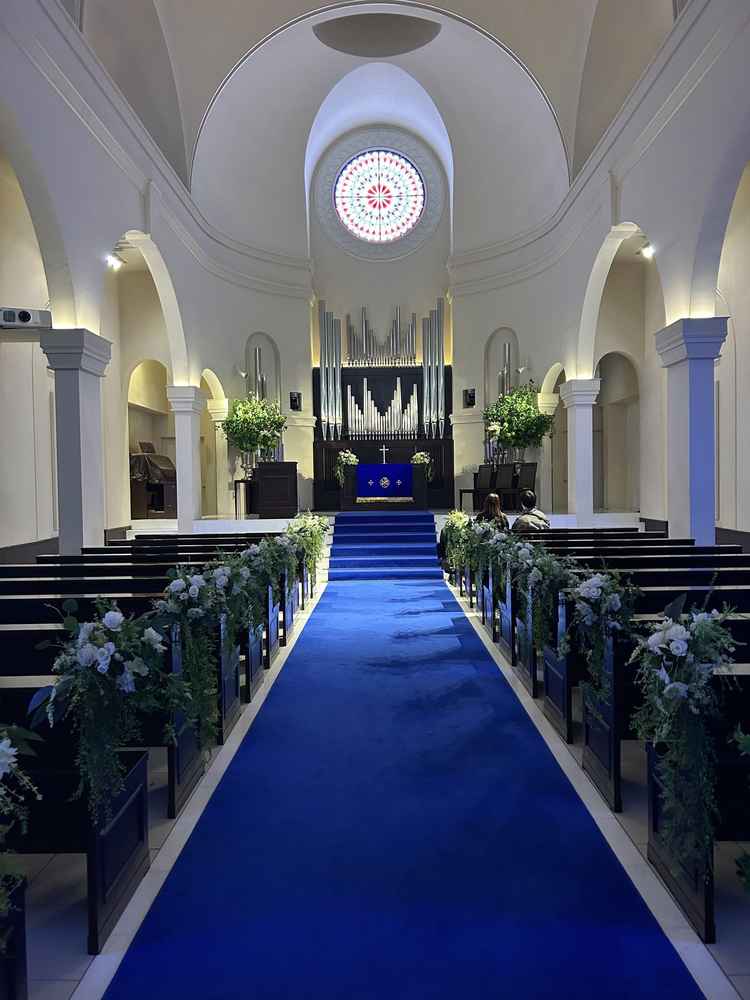 全天候型の安心感と青いバージンロードが魅力の式場