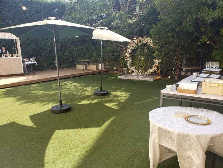 披露宴会場の天井が高くプライベートガーデンもありとても開放的な雰囲気だと感じました。青いヴァージンロードが印象的でした。