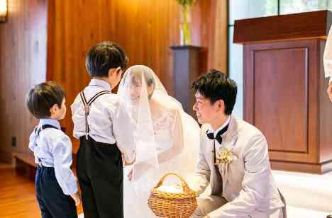 木の温もりが感じられるチャペルで大切なゲストの皆様に愛を誓ったおふたり。そんなおふたりの結婚指輪をお渡しする大役を任されたのがリングボーイのおふたり!新婦様の甥っ子でいらっしゃいます。兄弟で仲良く登場し、お兄ちゃんがリードしながらバージンロードを順調にお進みいただき、無事おふたりに指輪をお渡しされました。