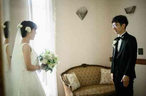 挙式の前までドレス姿を内緒にされていたおふたり。 着慣れない服に身を包んだおふたりの姿を見るのは初めて。ファーストミートは新婦様のお支度部屋にて行いました。 結婚式の始まりを実感したおふたりの間にはより一層緊張感が増しました。 礼拝堂内に足を踏み入れると木の温もりやお生花の香りが..。 チャペルの中ではご参列されていたご家族やゲストの皆様の嬉しそうな表情がとても印象的でした。