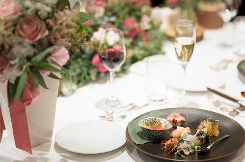 パーティー会場は教会の雰囲気も感じられるようなグリーンとピンクで統一されたコーディネートを。 お箸でも召し上がっていただける和フレンチのコースは、ご親族の皆様にも喜んでいただけました。