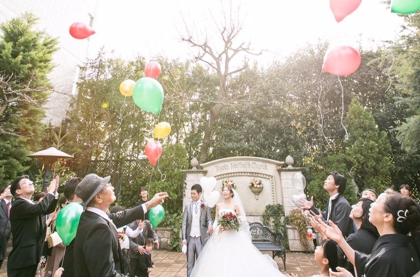 挙式後はガーデンにてご歓談のお時間を皆様で過ごしていただきました。 結びには、おふたりが選ばれた可愛らしいカラフルなバルーンを皆様でリリース。 おふたりの末永い幸せの願いを皆様でこめて・・・。