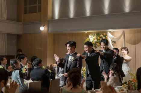 お色直しのための中座で、一緒にご退場されたのは新郎新婦様共通のご友人の皆様!列車のように仲良く並んでご退場されました♪手を振りながら明るい笑顔の皆様!新郎新婦様をよくご存知のご友人だからこそ胸いっぱいの思いが伝わってきました。ご友人の皆様の心にも残る素敵な思い出になりますね。これからもおふたりの幸せを皆様願っています。