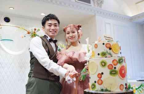 新婦様がパーティでのお召しになったドレスは胸元のフリルが印象的なピンクのカラードレス。ヘアスタイルにも新婦様のセンスがあふれる素敵なコーディネートでした★自分らしさを表現できるカラードレスで雰囲気を変えるのもパーティの演出としておすすめです!ウエディングケーキにはカラフルなフルーツをたくさんデコレーション!小さなお子様にも大好評のとても可愛らしいケーキでした。