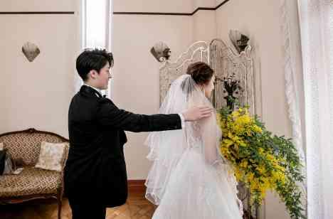 3月に挙式をされたおふたり。 教会のガーデンには毎年黄色いミモザのお花が満開に咲いております。 教会のモチーフフラワーをおふたりは大切な1日のブーケとして選ばれました。 黄色いミモザのブーケは純白のウェディングドレスにとても映え、より一層新婦様を美しく魅せるアイテムとなります。 元来、新婦様を守る魔除けといわれるブーケは、おふたりのこれからの未来を明るく照らします。