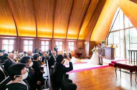 木の温もりが感じられるチャペル。今まで育ててくださったご家族様、共に成長し合えた大切なご友人様に見守られ、おふたりが新しい家族となりました。教会専属の牧師がおふたりとカウンセリングを行った上で、おふたりのためのメッセージをお伝えいたしました。お母様がエスコートをされた新婦様のご入場は涙をこらえながら1歩1歩と大切に進んでいらっしゃいました。