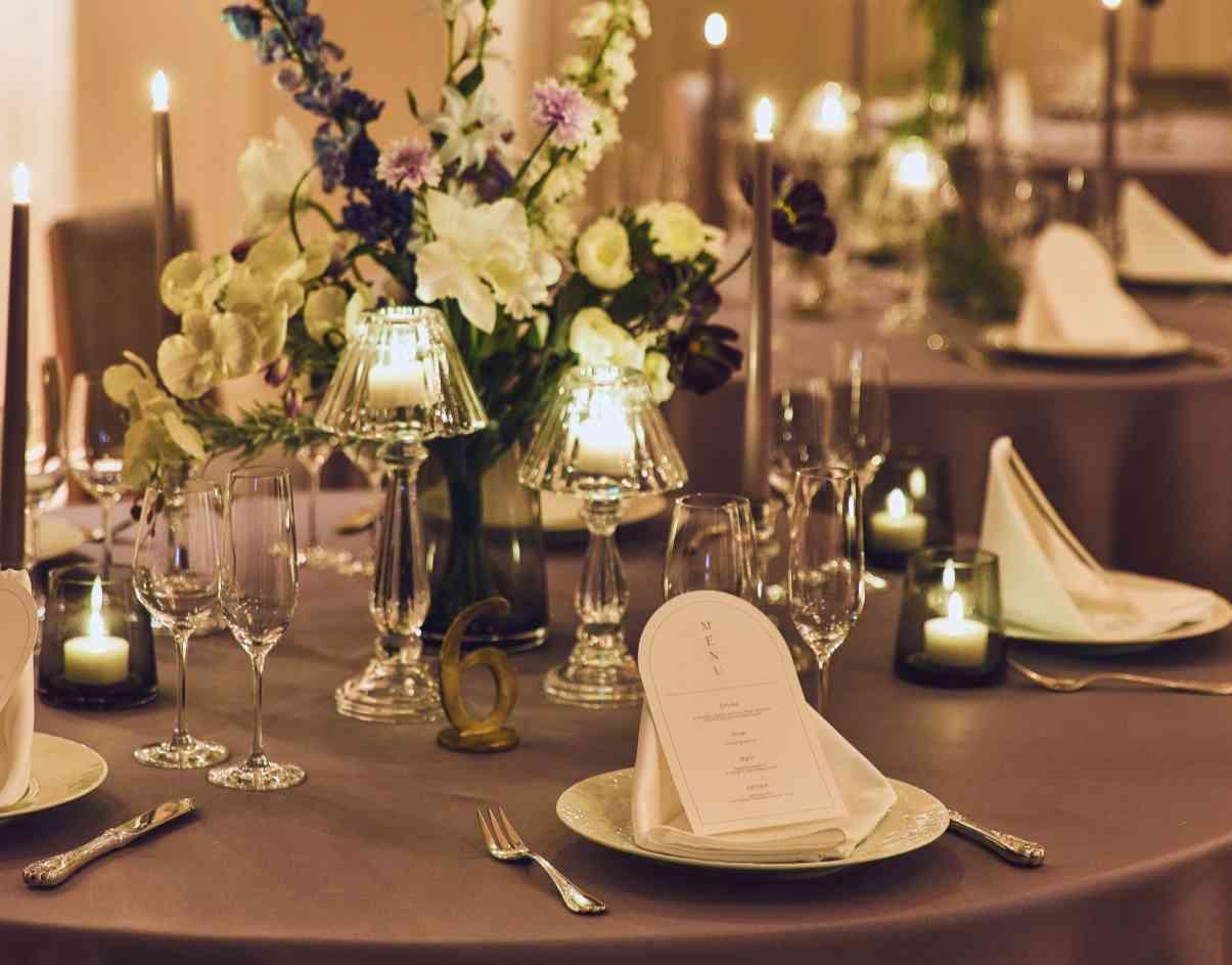 笑顔や涙の共感がひろがる、距離の近さが特徴的なパーティ会場。お2人が各テーブルを気兼ねなく行き来したり、メインテーブルに座ったままゲストと会話ができるような距離感が魅力。