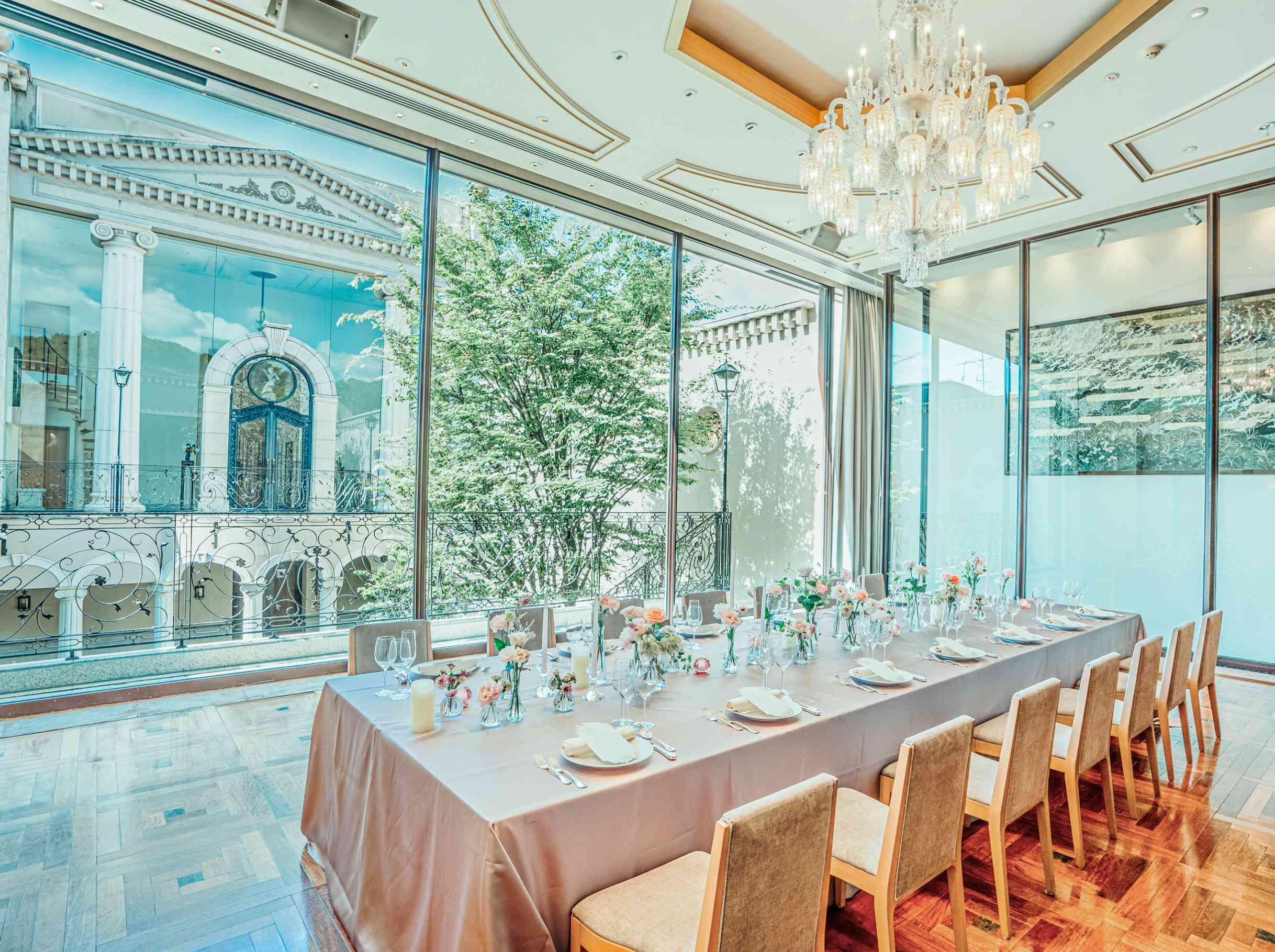 洗練された「迎賓館」のような設えと、自然光や緑が心地よい空間。天井高5m、2階吹き抜けの開放感を使い、幻想的なランタン演出やこだわりのコーディネートも思いのままに。やりたいことが全て叶うパーティ会場。