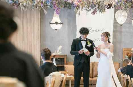 大好きなご家族様の前だからこそ、おふたりらしく素敵な笑顔でご結婚式が迎えられるよう、人前式をセレクト。 ゲストの印象に残る天井のドライフラワーが印象的なチャペルをお選びいただきました! お二人が誓いの言葉などもお考えになられ、笑顔で披露。とても和やかな雰囲気でご家族にもお二人の門出を見守って頂きました。