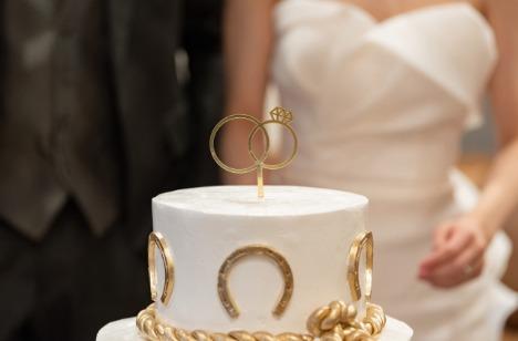 おふたりのウェディングケーキは競馬をイメージ!! ウェディングケーキには馬の"蹄鉄"と"縄"のモチーフを付けました♡ 馬の形等にはあえてせず、おふたりらしくおしゃれさもありつつ、存分におふたりらしさを表現しました!! ゲストの皆様からは笑いもありつつ、おふたりからもゲストの皆様へ幸せのおすそわけが出来ました♡