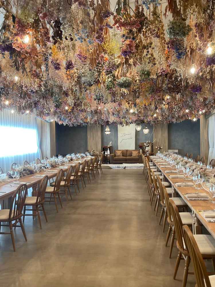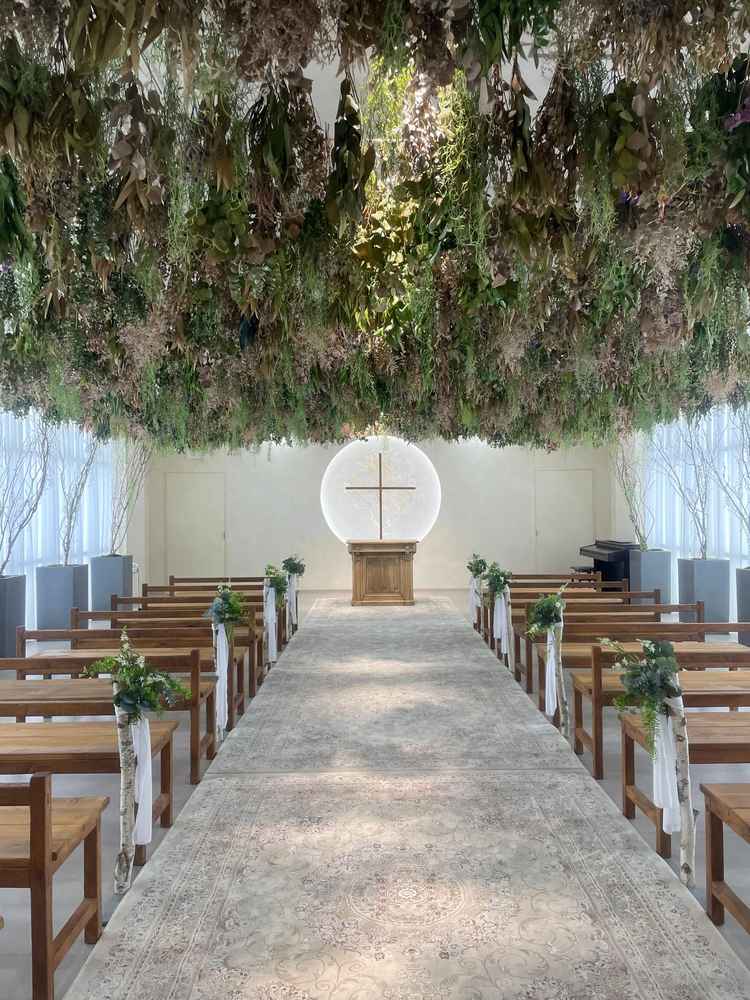 ドライフラワーをたくさん使った披露宴会場と空港近くにあるのが強みの式場