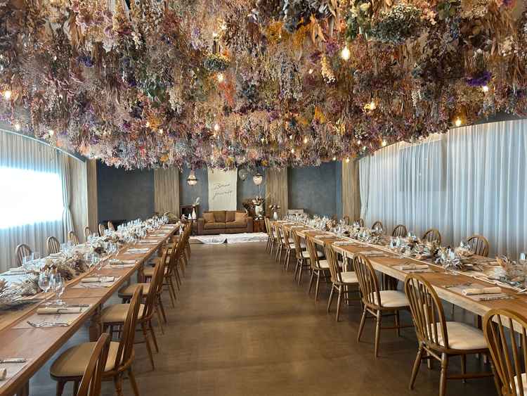 ドライフラワーをたくさん使った披露宴会場と空港近くにあるのが強みの式場