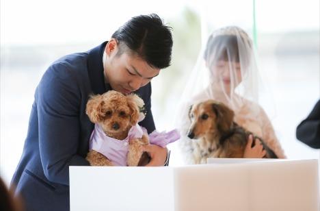 挙式では愛犬3匹に指輪を運んでもらう「リングドック」と結婚証明書に肉球スタンプをしてもらい、オリジナルの証明書を完成させました。3匹それぞれのペースでリングを運んできてくれ、会場も和やかな雰囲気に包まれました。