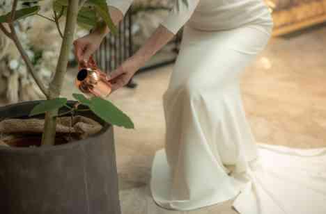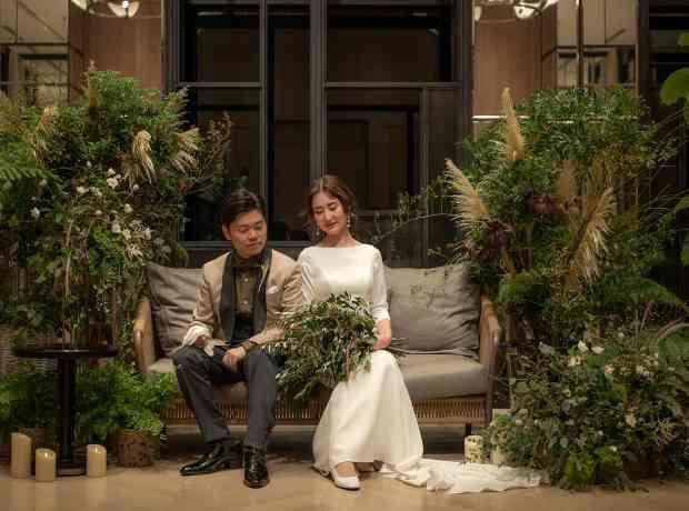空間デザイナーをされているご新婦様。会場は森林の中にいるかのような演出にすべく緑をふんだんに使い、挙式でも癒しの木【ウンベラータ】を使い、オリジナルの演出をされました。 ウンベラータの花言葉には「永久の幸せ」「夫婦愛」が込められており、ゲスト様に見守られおふたりの愛が永遠に続くよう土を重ね水を注ぎました。 3mもあるウンベラータは、演出だけではなくチャペルの空間装飾としても活躍しました。