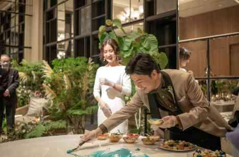 キンプトン新宿東京ならではの演出である、シェフによるアートキャンバスパフォーマンスを実施。 おふたりが前撮りを行った三浦半島をモチーフに、新郎新婦様とシェフの共同作業でアートデザートを仕上げ、次々と繰り広げられる色鮮やかなアートにゲスト様も見入っており、おふたりのWEDDINGのシンボルになるようなアートが完成致しました。 新郎新婦様のご縁がある場所を表した唯一無二のアートが素敵でした。