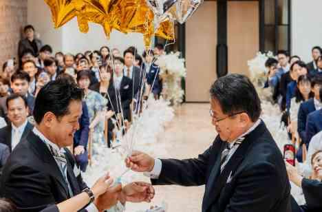結婚式を迎えるまでに沢山の人達が自分たちを繋げてくれたと感謝の想いを口にしていた新郎新婦。その想いを表現すべく、リングリレーを行いました。ゲストの皆様にもおふたりへの想いを目一杯込めてもらいながらリレーをし、指輪はゆっくりとおふたりの元へ。結びは両家父がその指輪をご自身の娘息子へしっかりと託しました。全員が温かく見守った中でのリングリレーで会場がひとつになった瞬間でした。