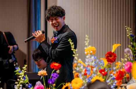 とにかく今日この場に大切な人たちが全員集まるという瞬間を目に焼き付け、自身の溢れる「ありがとう」の気持ちを全員に伝えたいと、歌うたいのバラッドをゲストへサプライズで新郎が歌われました。優しくも力強い歌声に皆様が聞き入り、涙されるゲストも。新婦もその一人で、新郎が全員に伝えたい魂が宿った歌声が印象的でした。
