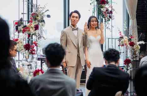 挙式は既に神社にて神前式を執り行っていた為、キンプトン新宿東京では宴内人前式のようなセレモニーを取り入れました。四方から自然光が差し込む柔らかな空間の中、大切な愛犬を登場させたリングセレモニーを実施し、皆様に見守られ改めて夫婦としての決意を見せたおふたり。おふたりのイニシャルが反映されたリングピローを首輪に付け、おふたりの元へ会場内を駆け足気味に進む愛犬のお姿は、大変可愛らしい演出になりました。
