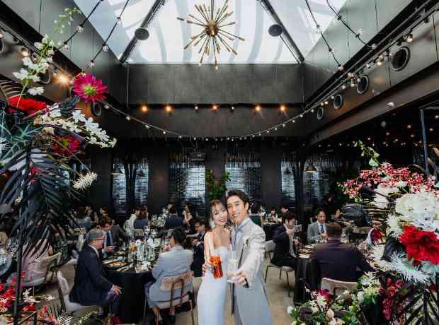 キンプトンらしさが抜群に演出された最上階の人気会場【Loft】。Loftのインダストリアルな空間を最大限に引き出した、黒を基調としアクセントカラーを差し入れたシックな空間が、よりパーティを非日常感溢れお洒落な空間へと導きました。披露宴のデザインに合わせ、ご新婦の衣装やヘアメイク、ブーケ等もマッチした統一感を重視しシンプルなデザインへ。ミニマルなスタイルが際立つ空間となりました。