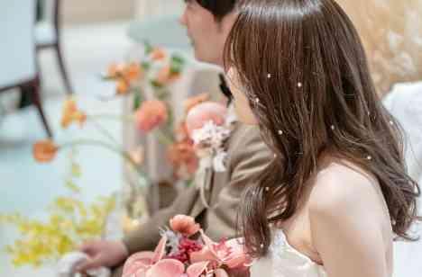 挙式から引き続き、ウェディングドレスで入場をする披露宴ですが、その際にヘアスタイルをチェンジ! チャペルと、披露宴会場の雰囲気は異なるため、そのシーンごとにスタイルを変化させてご登場** 挙式から引き続き、シンプルな雰囲気は残しつつガラッとダウンスタイルへチェンジされましたが、アクセントにクリアストーンを付けて、横から見ても華やかなおしゃれスタイルが完成。