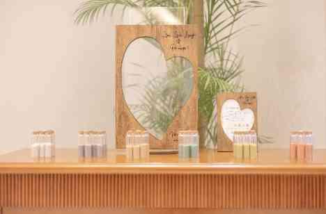挙式の前にゲストにお配りしたのは「サプライズリングボックス」指輪交換の前に一斉オープン。中には指輪ではなくお菓子が入っており、当たりのオレンジ飴が入っていたゲストがおふたりに指輪を届けてくださいました。そして、結婚証明書としておふたりがご準備されたのは「サンドセレモニー」砂の色にはそれぞれ意味があり、結婚生活で大切なものをゲストに選んでいただき、世界に一つだけのサンドアートが完成いたしました。